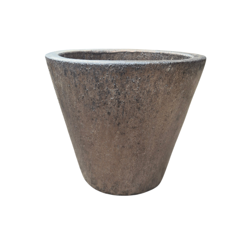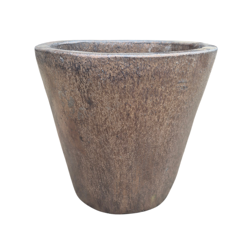 Cone shaped planter with a flat rim in a semi matt bronze finish with metallic elements that glisten in the light.