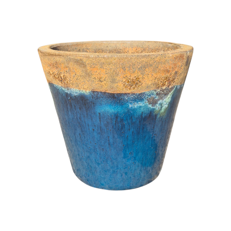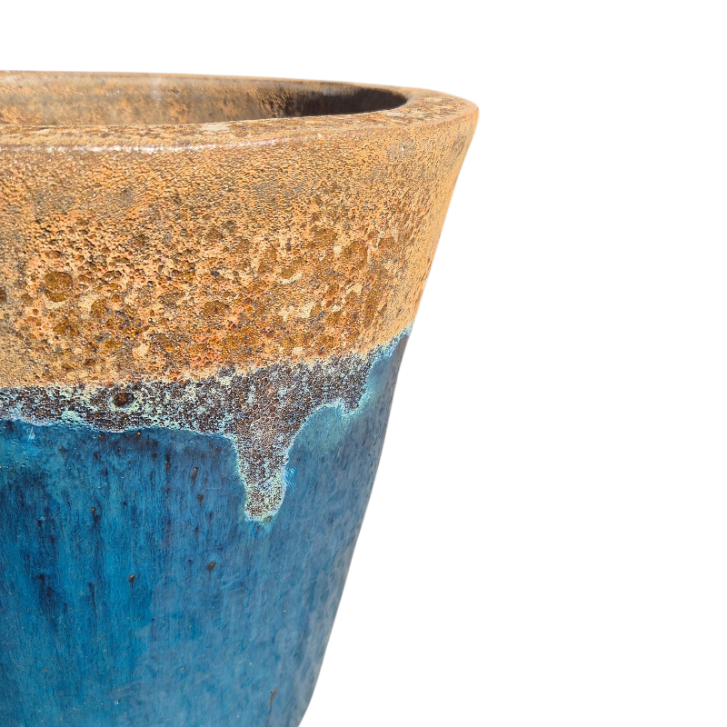 Cone shaped planter with a flat rim and a rust textured lava stone top going in to a sea blue glazed body.